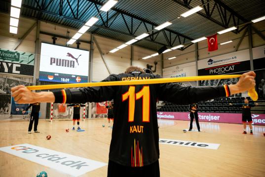 Bildbeschreibung: Unser Spieler Lukas Kaut (11) mit einem Theraband beim Aufwärmen während der WM 2023 in Kopenhagen. Hier zu sehen mit einem Langarmtrikot im Herrenschnitt. Foto: GSC Frankenthal / Cambrothers