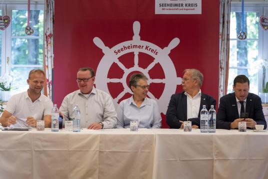 Auf dem Bild von links nach rechts: Benny Volkmann (Geschäftsführer des FC Bayern e. V.), Uwe Schmidt, Bundestagsabgeordneter aus Bremerhaven und einer der drei Sprecher des Seeheimer Kreises, Christiane Weber (Bundestrainerin der Frauen-Handballnationalmannschaft der Gehörlosen), Dr. Peter Merten (Präsident Deutscher Eishockey-Bund) und Claus Gröbner (Generalsekretär Deutscher Eishockeybund). Foto: Seeheimer Kreis